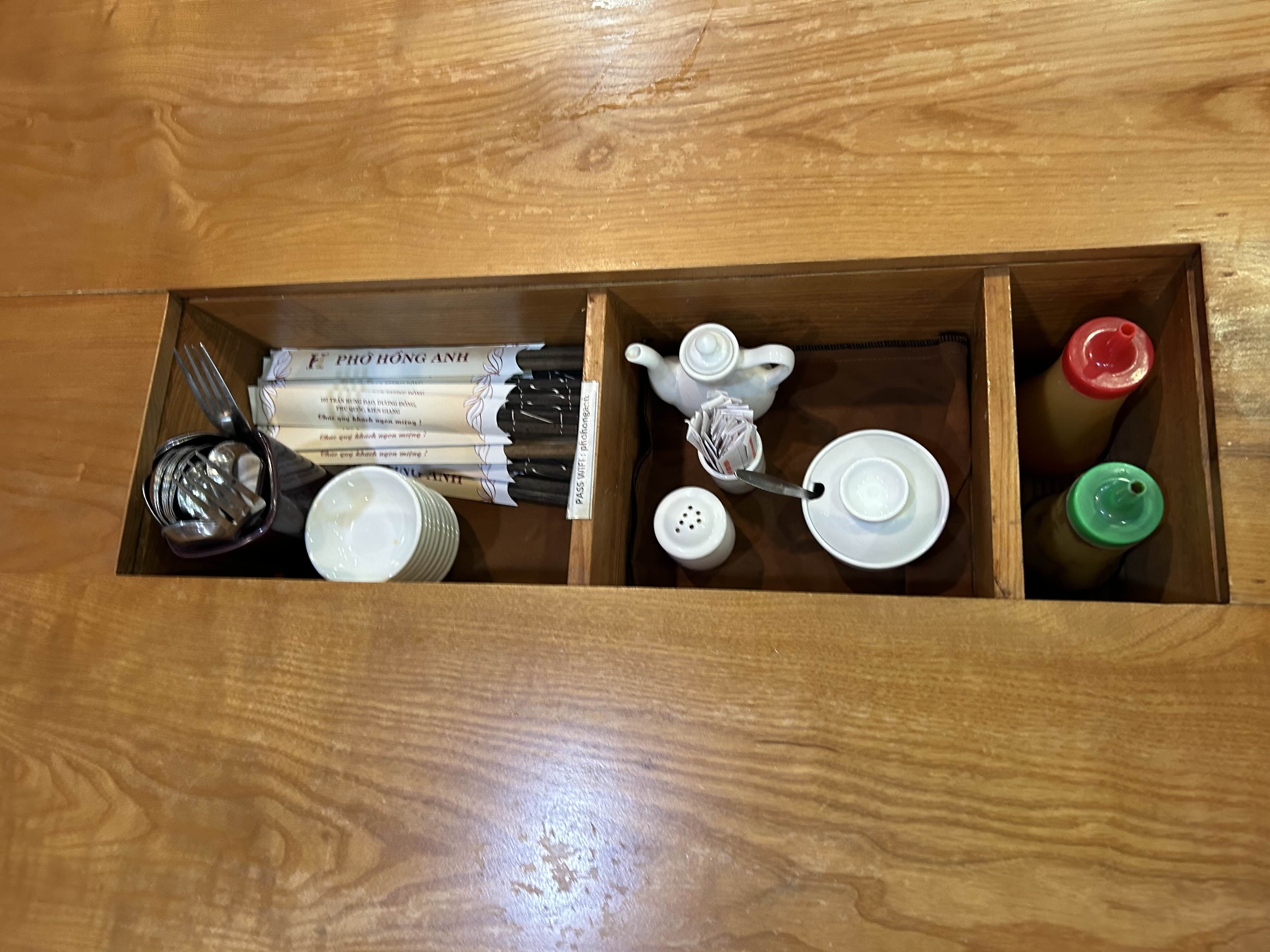 각종 소스와 수저를 꺼낼 수 있었어요.