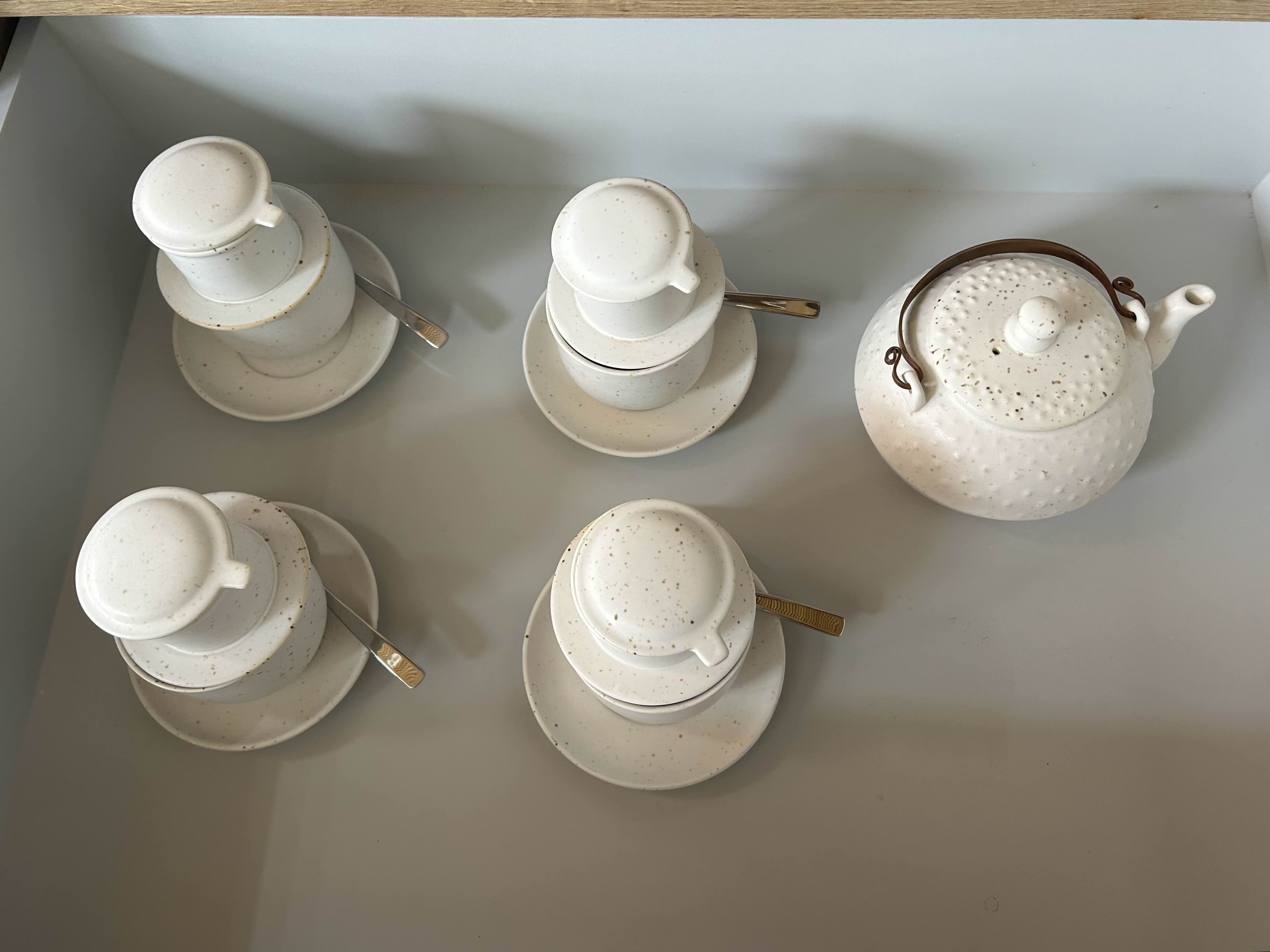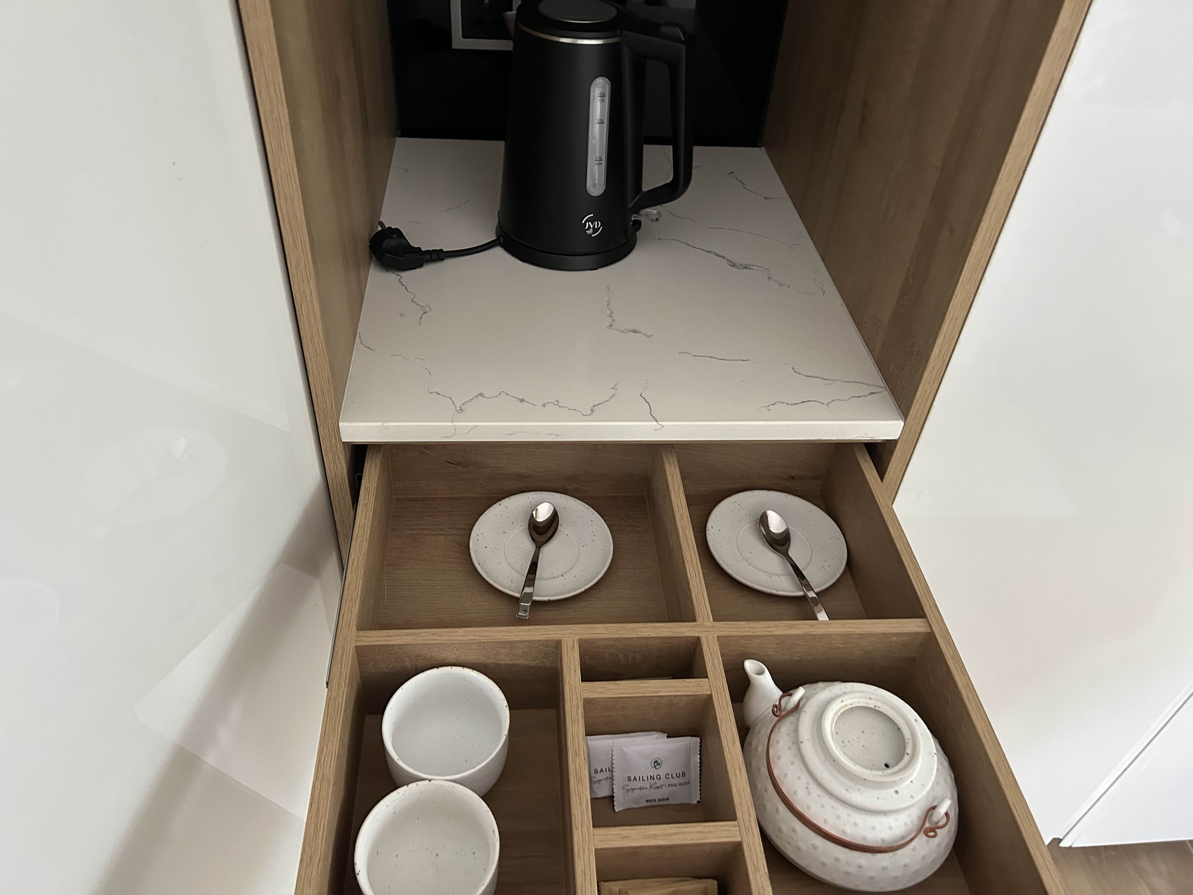 서랍엔 커피포트와 다도를 위찬 도구,