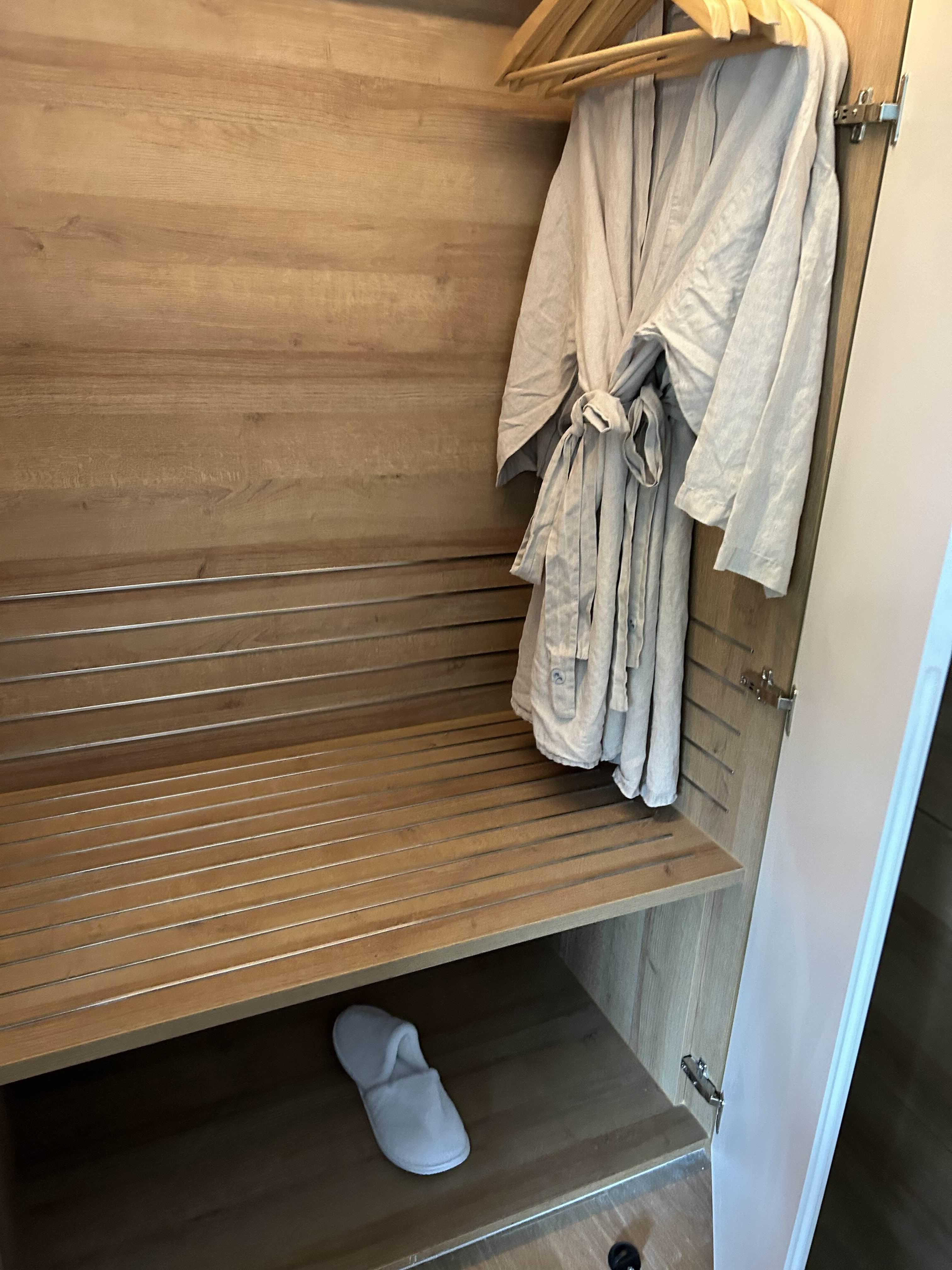 옷장엔 샤워가운과 실내 슬리퍼가 있었어요.