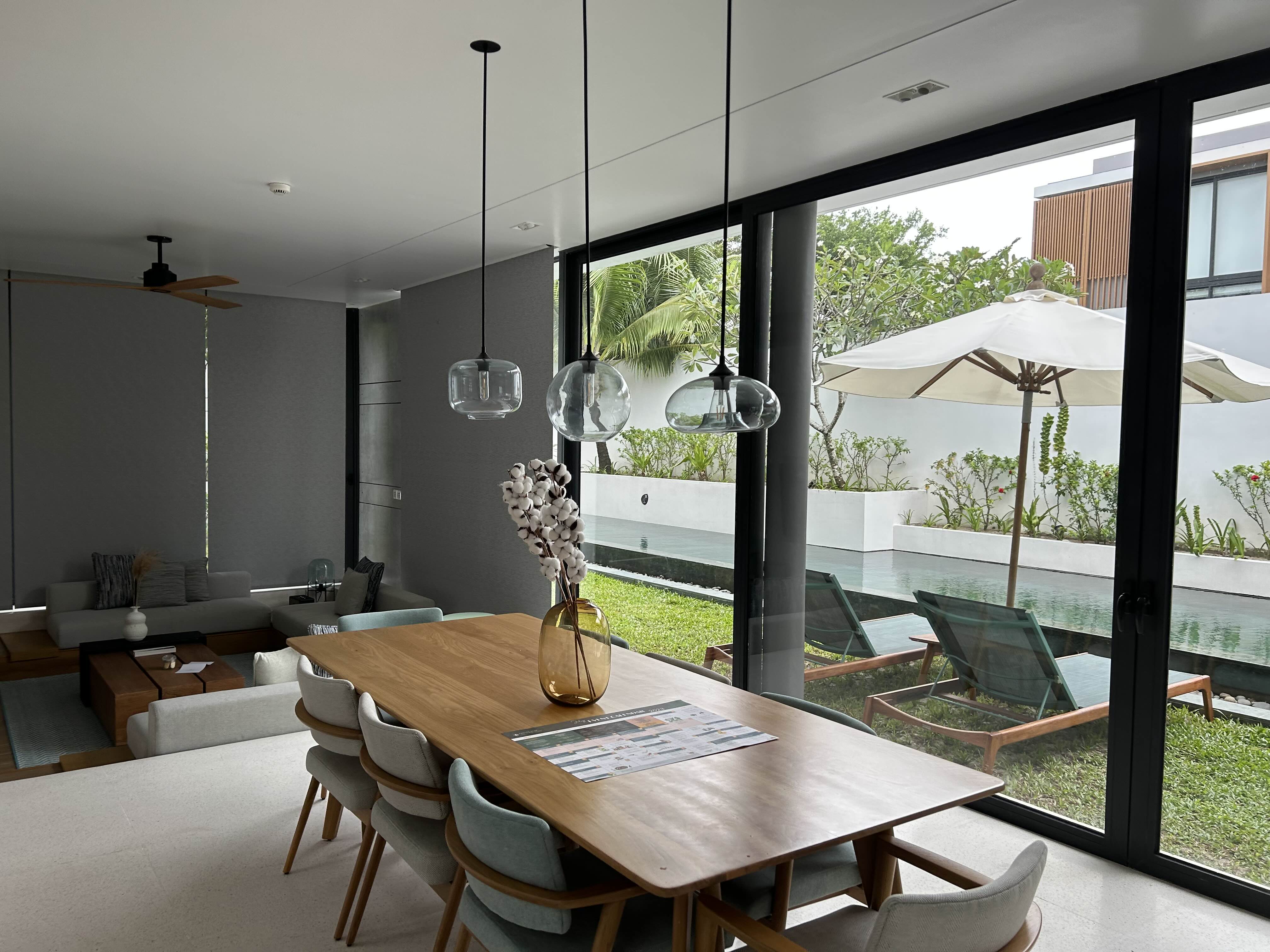 프라이빗풀을 보러 거실의 통창을 통해 나왔어요.