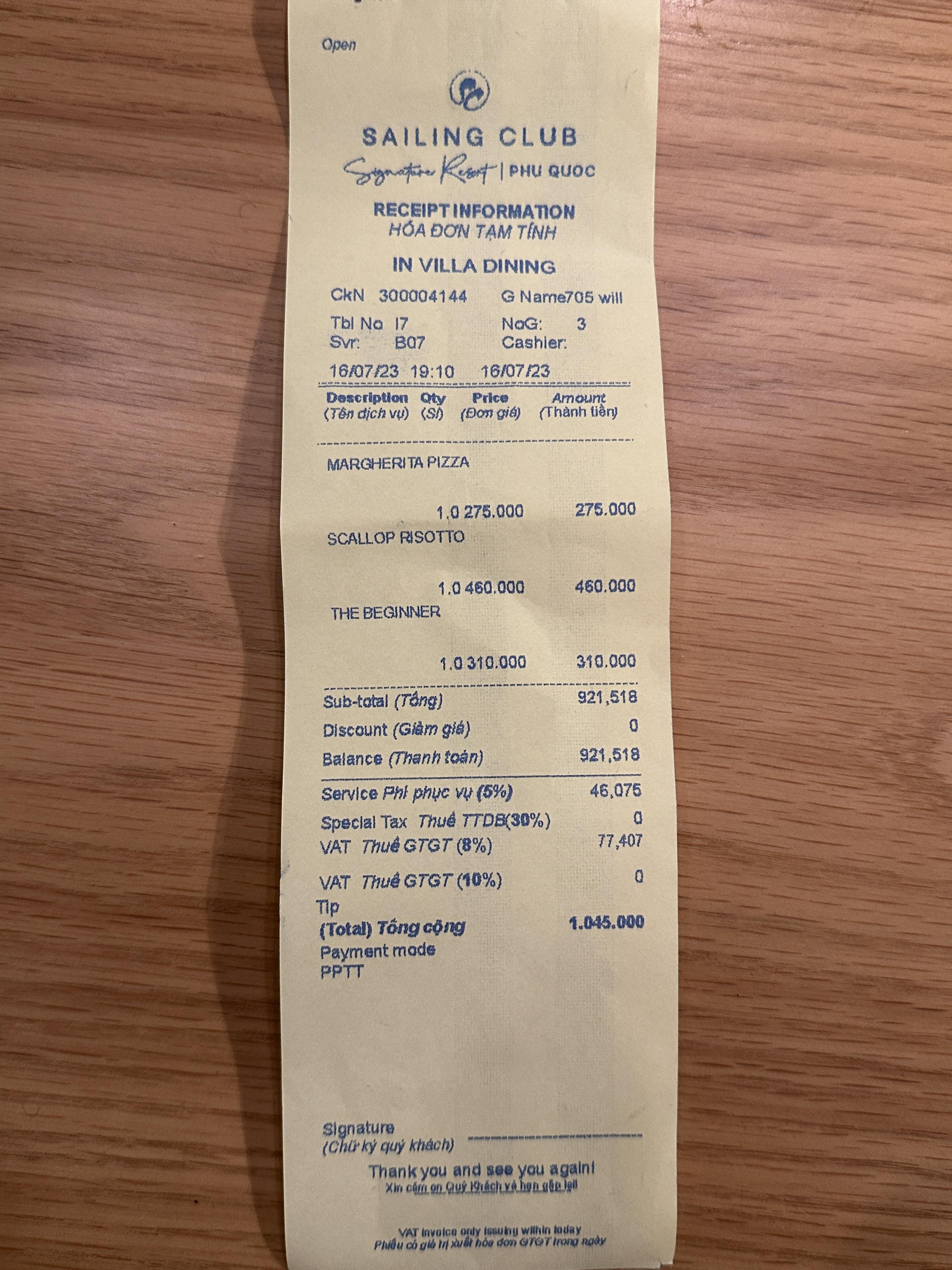총 1,045,000동(약 57,000원 정도) 나왔어요.