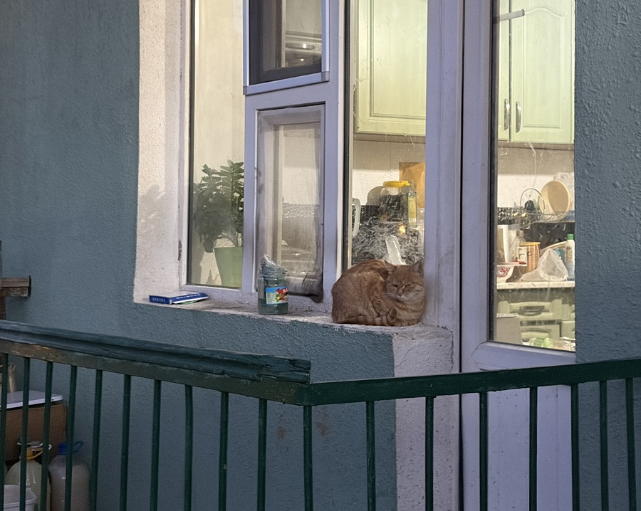 커피를 테이크아웃 하고 길거리에서 고양이 보며