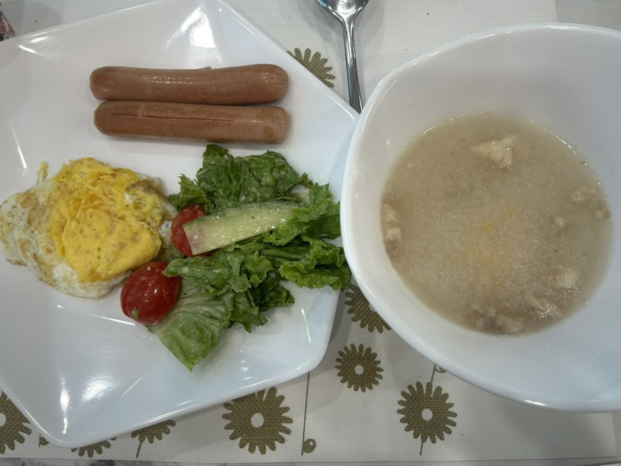 계란 프라이와 샐러드, 삶은 소시지가 있었고