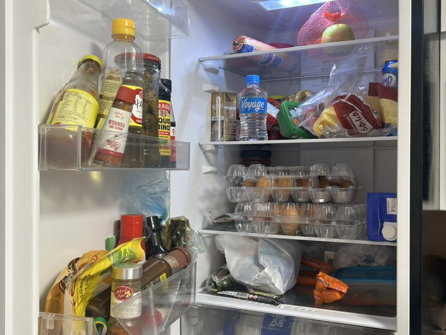 냉장고 안에 계란과 각종 식재료가 있었어요.