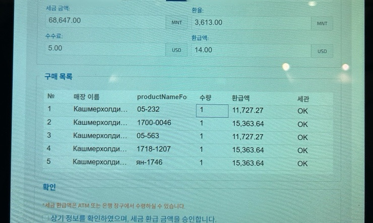 여권번호 입력하면 구매 내역이 뜨고