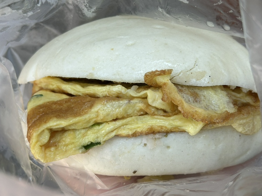 흰 찐빵에 계란 부침이 들어간 메뉴래요.